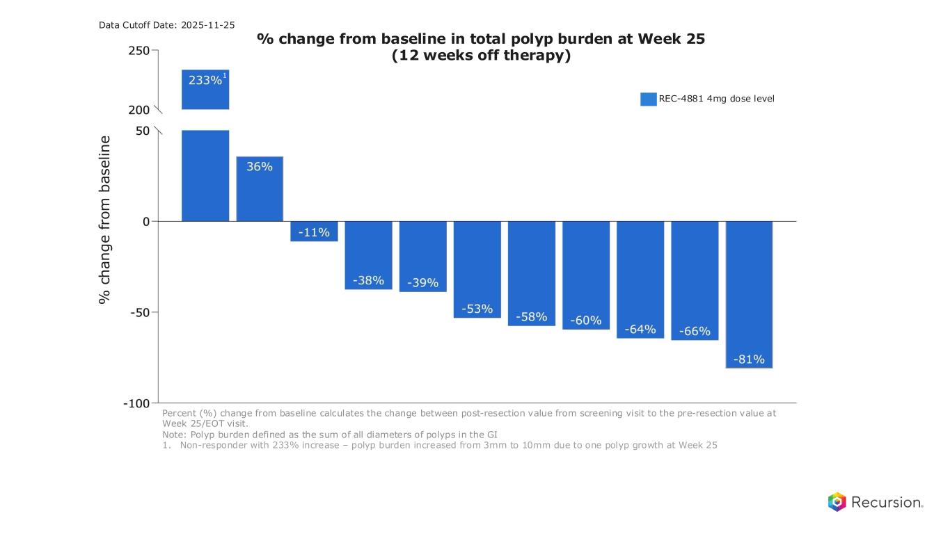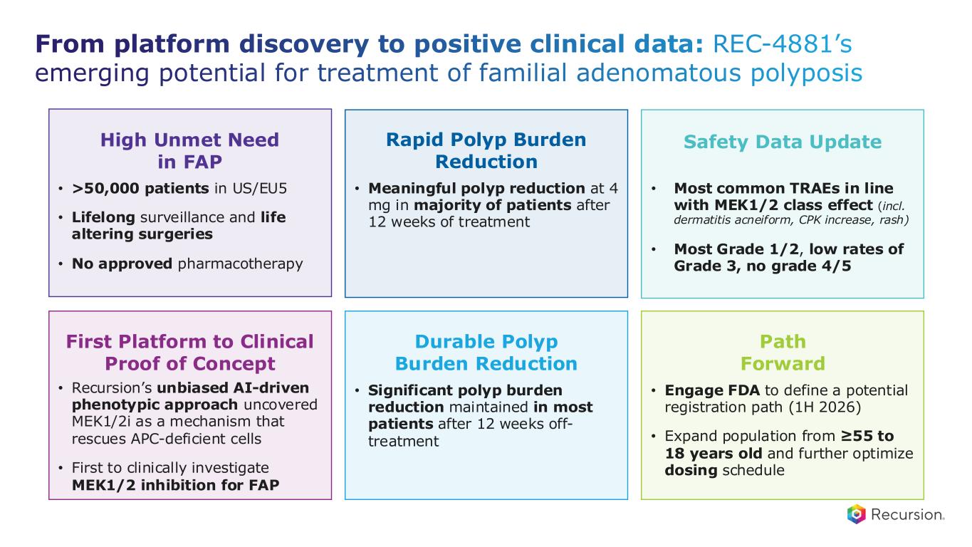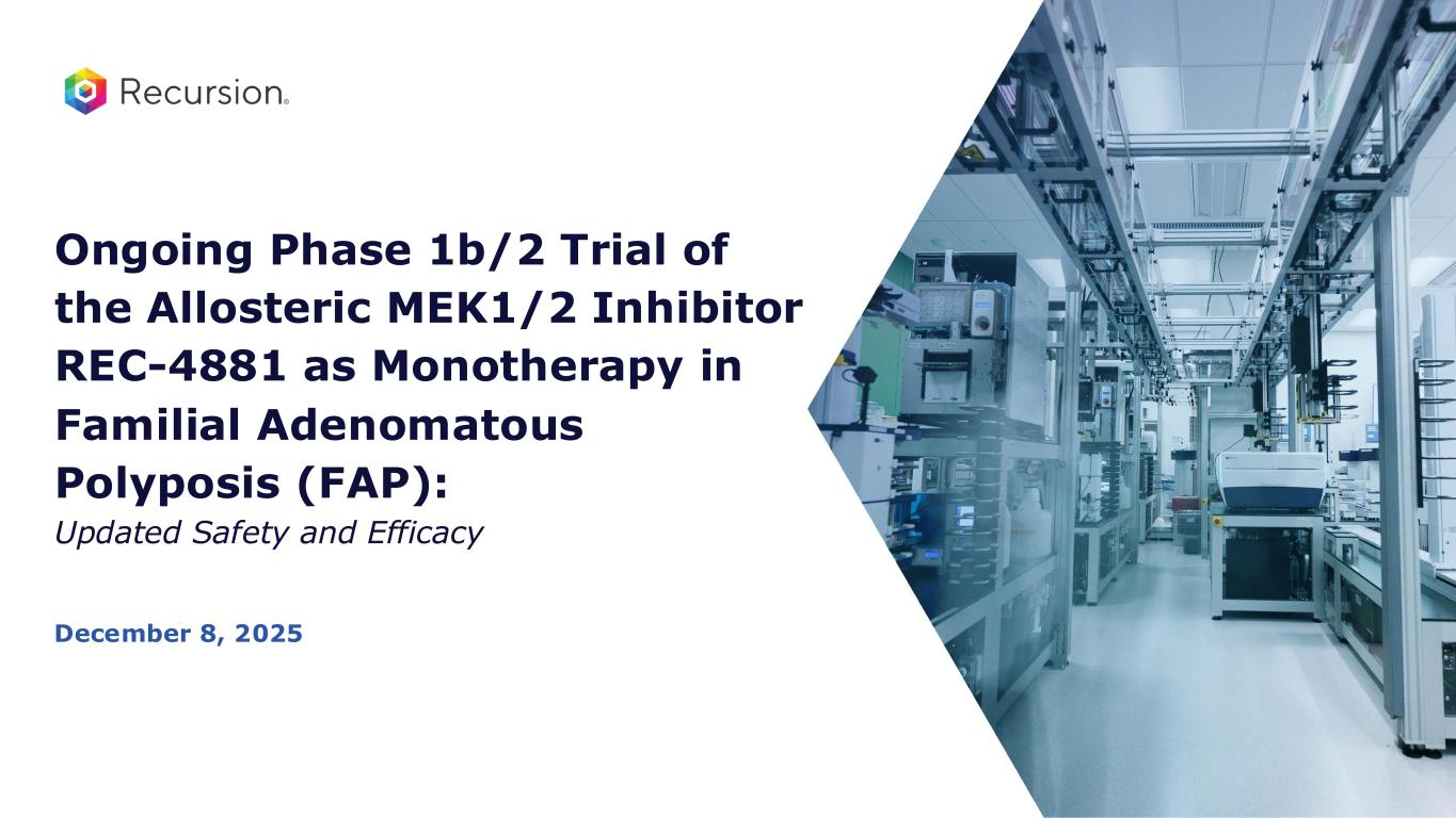 SALT LAKE CITY, December 8, 2025 (GLOBE NEWSWIRE) — Recursion (Nasdaq: RXRX), a clinical-stage TechBio company decoding biology to radically improve lives, today announced positive Phase 1b/2 data from the ongoing TUPELO trial of REC-4881, an investigational allosteric MEK1/2 inhibitor for familial adenomatous polyposis (FAP).