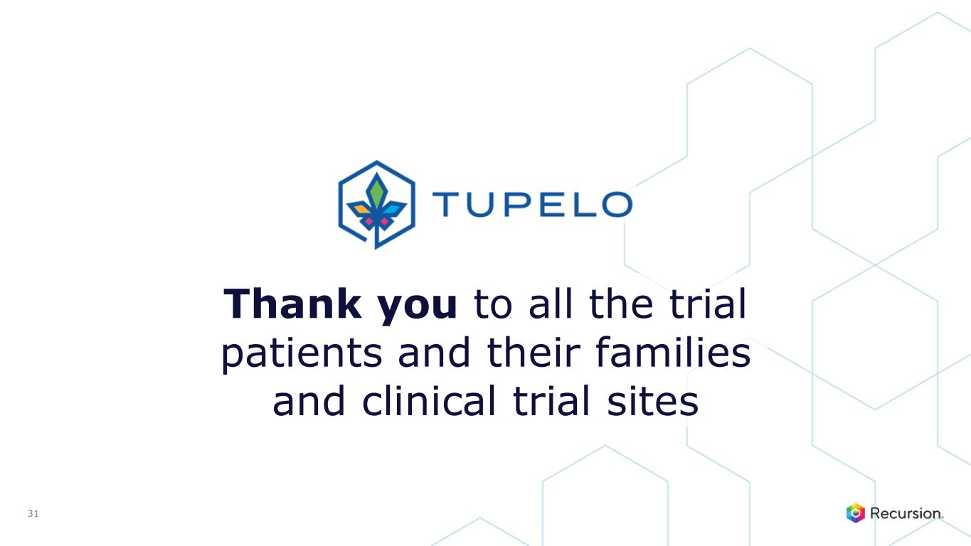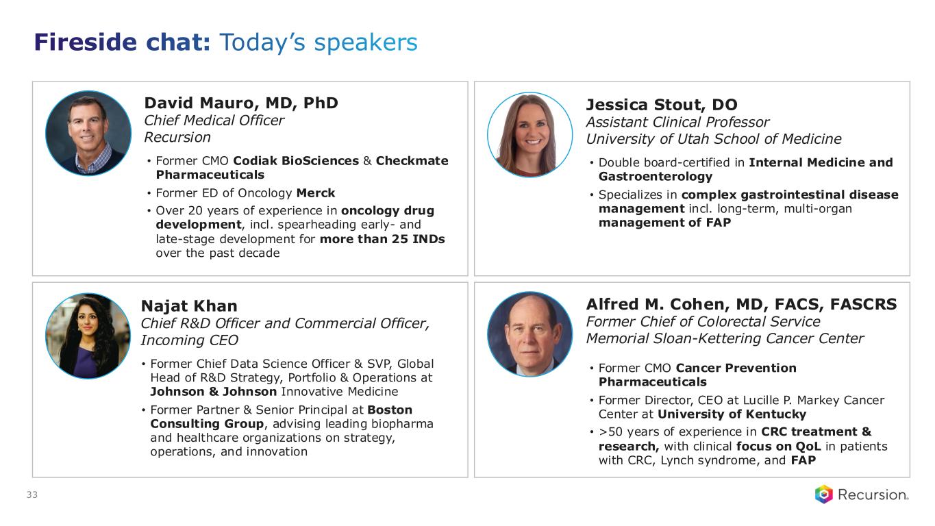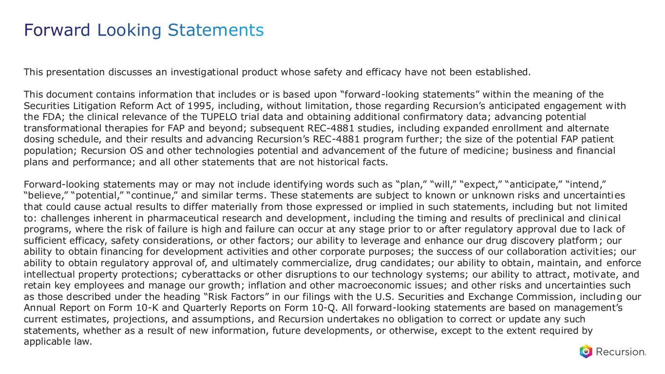 This presentation discusses an investigational product whose safety and efficacy have not been established. This document contains information that includes or is based upon “forward-looking statements” within the meaning of the Securities Litigation Reform Act of 1995, including, without limitation, those regarding Recursion’s anticipated engagement w ith the FDA; the clinical relevance of the TUPELO trial data and obtaining additional confirmatory data; advancing potential transformational therapies for FAP and beyond; subsequent REC-4881 studies, including expanded enrollment and alternate dosing schedule, and their results and advancing Recursion’s REC-4881 program further; the size of the potential FAP patient population; Recursion OS and other technologies potential and advancement of the future of medicine; business and financial plans and performance; and all other statements that are not historical facts. Forward-looking statements may or may not include identifying words such as “plan,” “will,” “expect,” “anticipate,” “intend,” “believe,” “potential,” “continue,” and similar terms. These statements are subject to known or unknown risks and uncertainties that could cause actual results to differ materially from those expressed or implied in such statements, including but not limited to: challenges inherent in pharmaceutical research and development, including the timing and results of preclinical and clinical programs, where the risk of failure is high and failure can occur at any stage prior to or after regulatory approval due to lack of sufficient efficacy, safety considerations, or other factors; our ability to leverage and enhance our drug discovery platform; our ability to obtain financing for development activities and other corporate purposes; the success of our collaboration activities; our ability to obtain regulatory approval of, and ultimately commercialize, drug candidates; our ability to obtain, maintain, and enforce intellectual property protections; cyberattacks or other disruptions to our technology systems; our ability to attract, motivate, and retain key employees and manage our growth; inflation and other macroeconomic issues; and other risks and uncertainties such as those described under the heading “Risk Factors” in our filings with the U.S. Securities and Exchange Commission, including our Annual Report on Form 10-K and Quarterly Reports on Form 10-Q. All forward-looking statements are based on management’s current estimates, projections, and assumptions, and Recursion undertakes no obligation to correct or update any such statements, whether as a result of new information, future developments, or otherwise, except to the extent required by applicable law. Forward Looking Statements