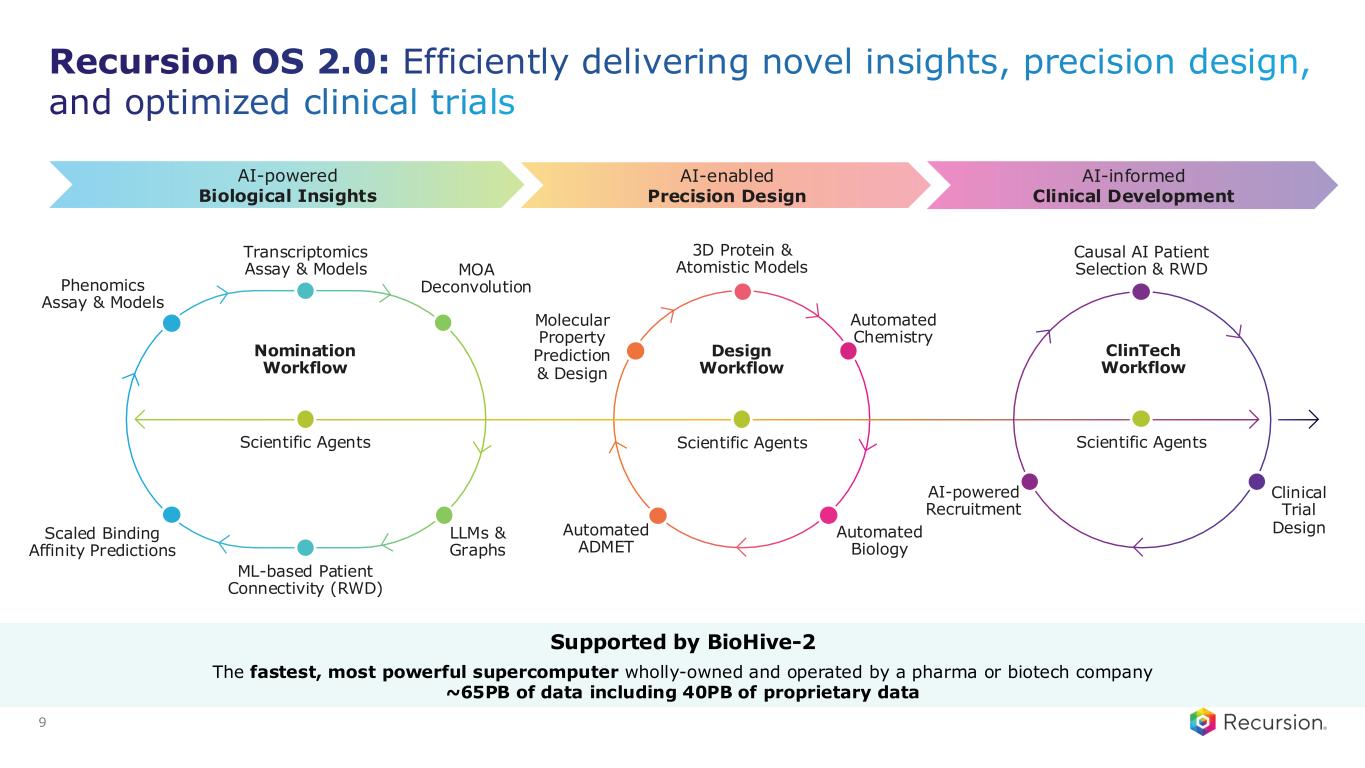 Design Workflow Automated ADMET Automated Chemistry Automated Biology 3D Protein & Atomistic Models Molecular Property Prediction & Design Scientific Agents Nomination Workflow Scientific Agents Transcriptomics Assay & Models ML-based Patient Connectivity (RWD) LLMs & Graphs MOA Deconvolution Scaled Binding Affinity Predictions Phenomics Assay & Models Clinical Trial Design ClinTech Workflow AI-powered Recruitment Causal AI Patient Selection & RWD AI-enabled Precision Design AI-powered Biological Insights AI-informed Clinical Development Scientific Agents Recursion OS 2.0: Efficiently delivering novel insights, precision design, and optimized clinical trials 9 Supported by BioHive-2 The fastest, most powerful supercomputer wholly-owned and operated by a pharma or biotech company ~65PB of data including 40PB of proprietary data
