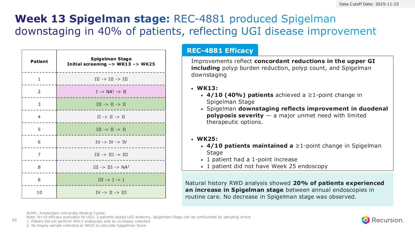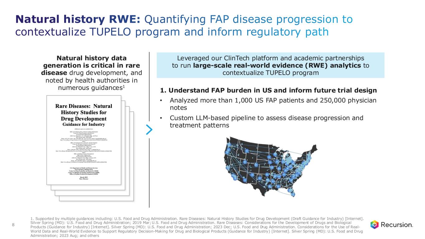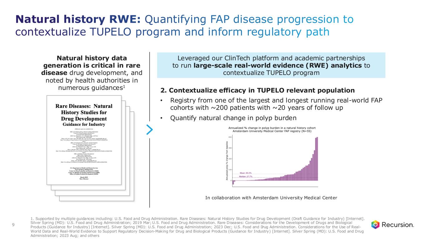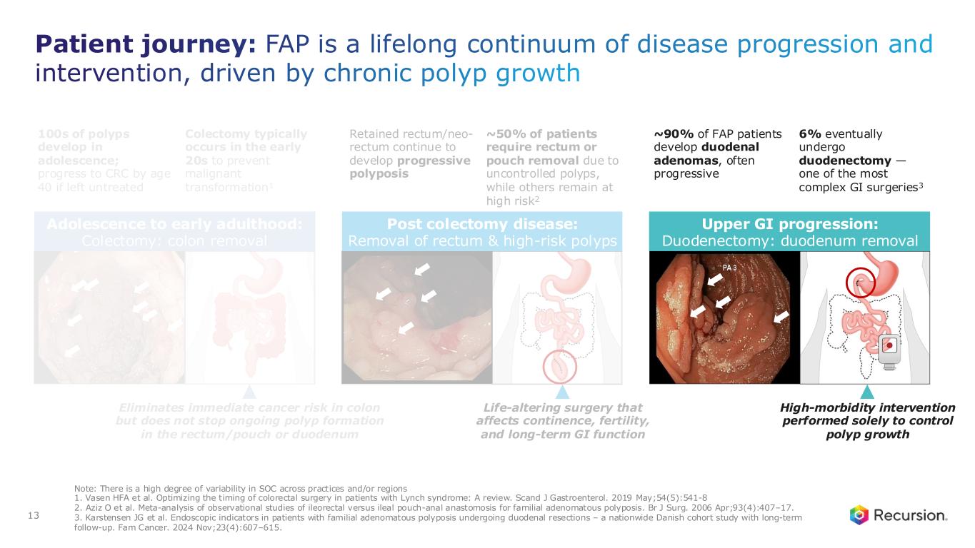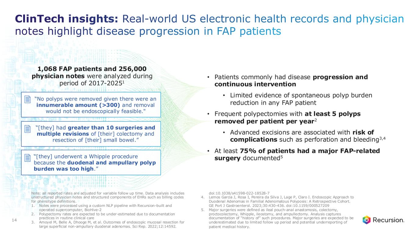 Today, the Company is using the Recursion OS 2.0 platform—including proprietary ClinTech capabilities of large-scale real-world evidence (RWE) analytics—to further advance the REC-4881 program. This includes a comprehensive natural history collaboration with Amsterdam University Medical Center, home to one of the largest and longest-running FAP registries, as well as analysis of more than 1,000 US FAP patients and 250,000 physician notes processed through Recursion’s custom LLM-based pipeline. Together, these data reinforce the relentlessly progressive nature of FAP, highlight the absence of spontaneous polyp regression, and demonstrate the substantial burden of repeated polyp-removal procedures and major surgeries experienced by real-world patients.