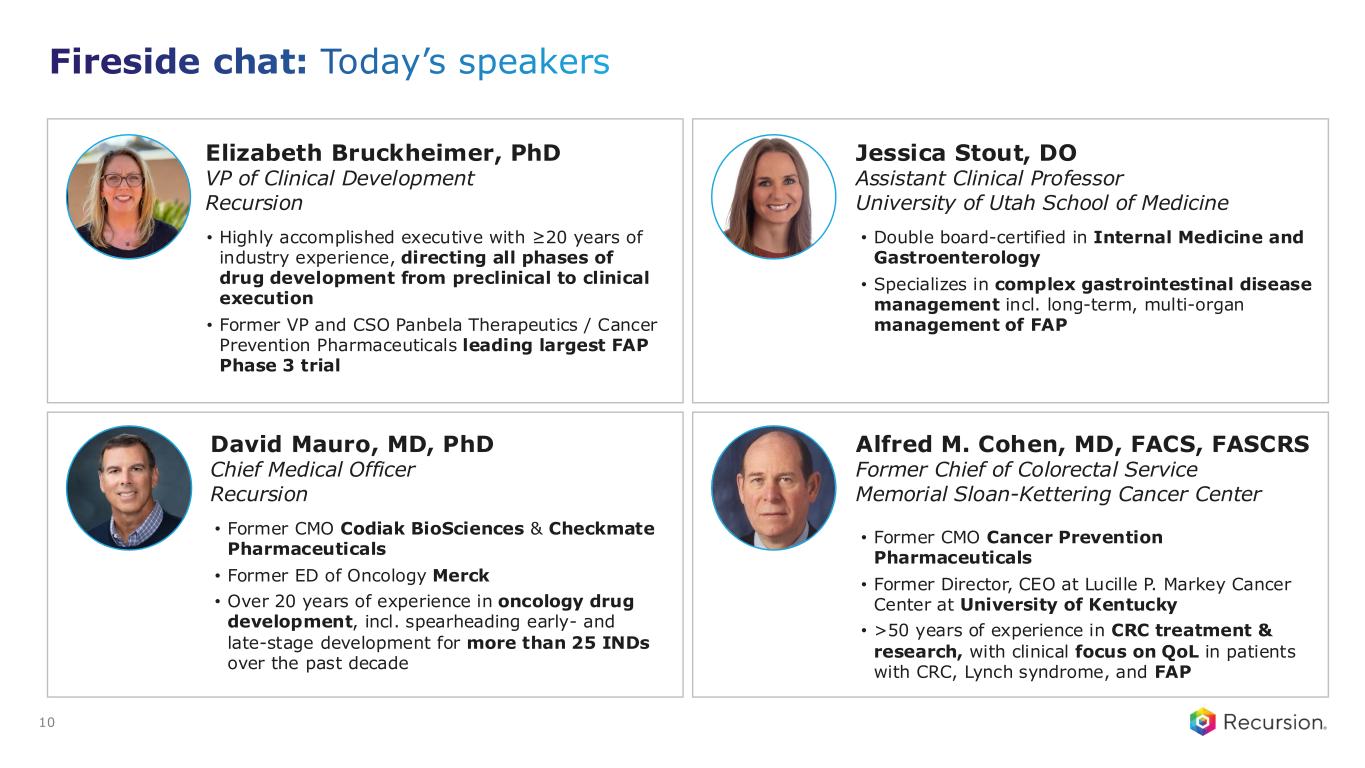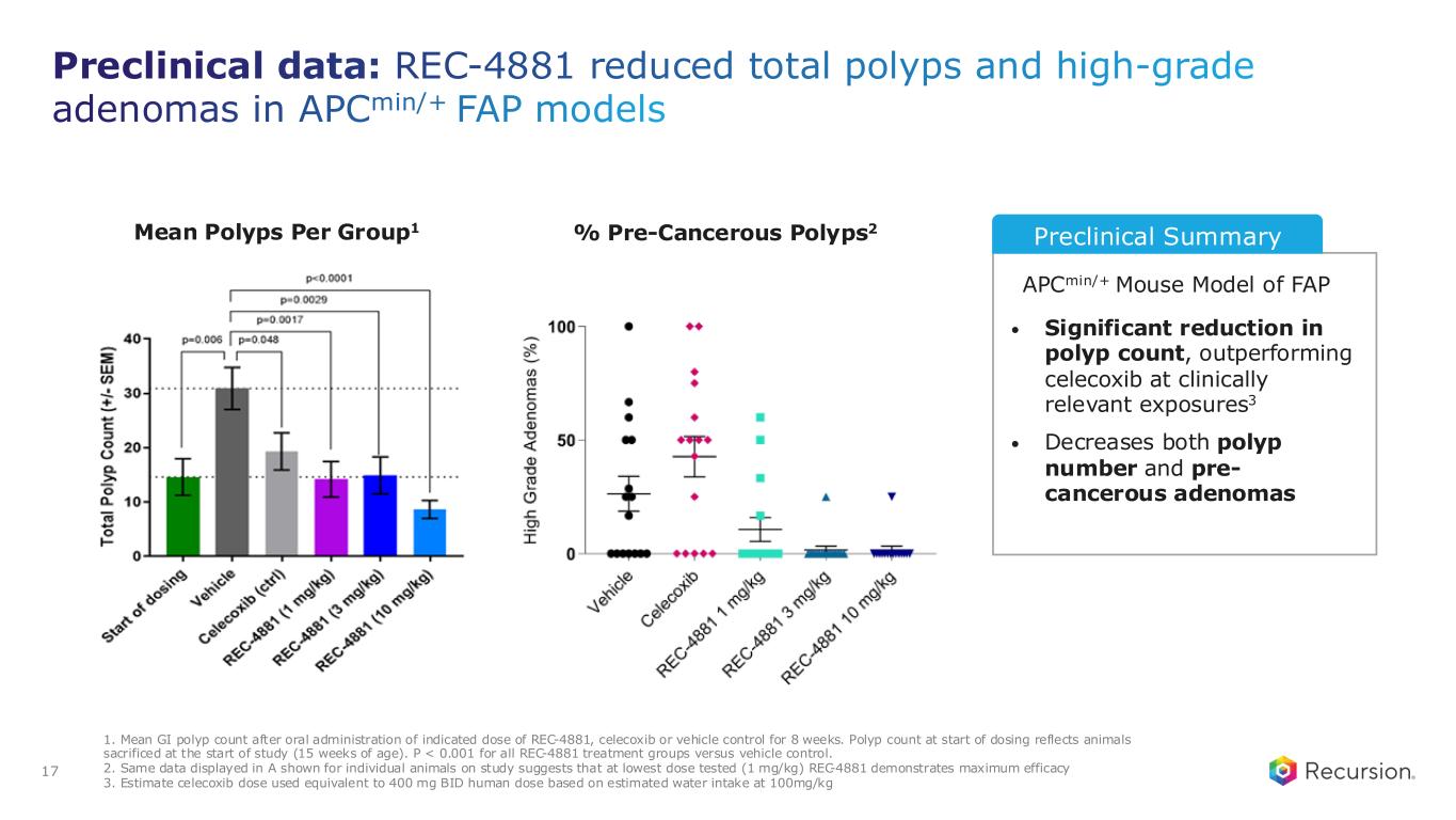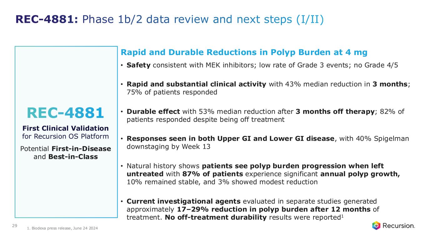 durable reductions in polyp burden in patients. This is a powerful example of how even the earliest versions of the Recursion OS can uncover therapeutic opportunities in diseases with no approved pharmacotherapy options. And since this discovery, we’ve only added to the breadth, depth, and power of the Recursion OS; we believe this is the first of many potential medicines that will advance as our flywheel of discovery accelerates”.