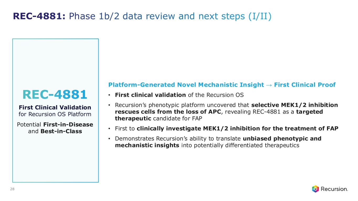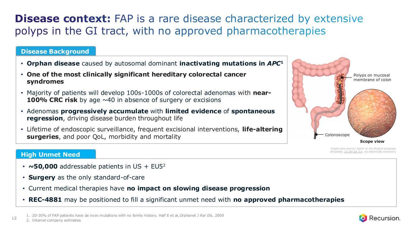 ●First clinical validation of the Recursion OS, demonstrating how unbiased phenotypic and mechanistic insights—such as MEK1/2 rescue of APC loss-of-function—can translate to novel, differentiated therapeutics for diseases like FAP with no approved therapy and high prevalence of 50,000 patients in US and EU5