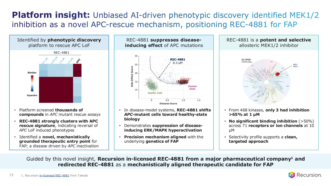 Through an unbiased phenotypic screen of thousands of compounds, the earliest version of the Recursion OS identified selective MEK1/2 inhibition as a highly specific mechanism capable of reversing APC loss-of-function signatures. Using high-content cellular phenomics driven by AI, REC-4881 emerged as one of the strongest phenotypic rescue hits, reverting APC-deficient cells toward a healthy state and suppressing ERK/MAPK hyperactivation downstream of APC loss. Guided by this AI-driven insight, Recursion in-licensed REC-4881 from Takeda and redirected REC-4881—originally evaluated clinically in solid tumors—as a mechanistically aligned therapeutic candidate for FAP. REC-4881 is now the first MEK1/2 inhibitor ever studied clinically for this disease.