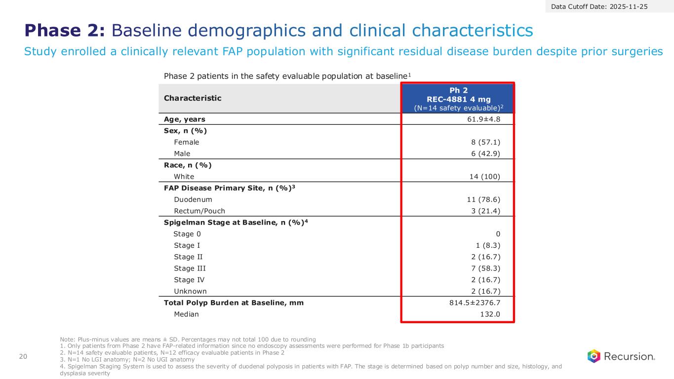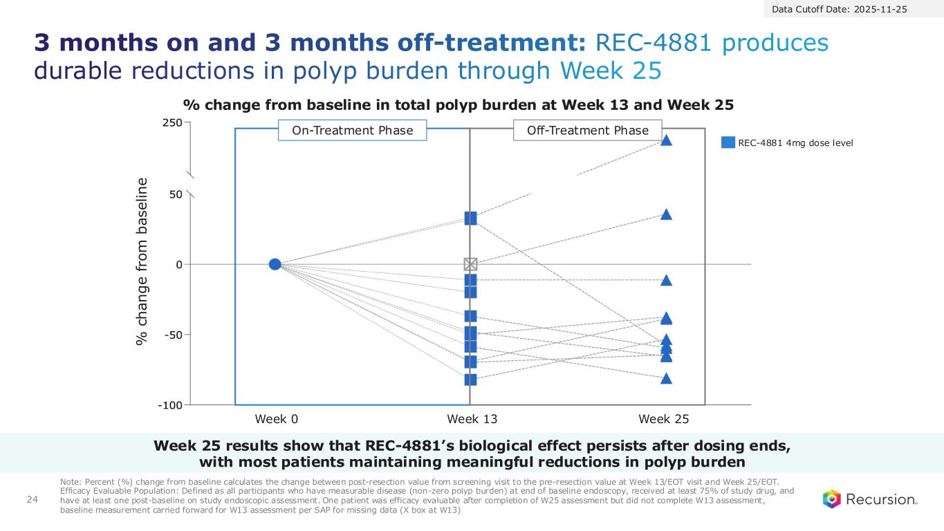 As of the November 25, 2025 data cutoff in the open-label Phase 2 portion of TUPELO, treatment with REC-4881 (4 mg QD) demonstrated meaningful and durable reductions in polyp burden in patients with FAP.