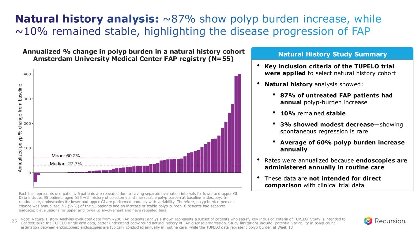 To better understand the natural history of FAP and to contextualize the single-arm efficacy of REC-4881, we collaborated with Amsterdam University Medical Center to analyze a registry of ~200 patients with FAP. 55 of these patients met the key inclusion criteria of TUPELO. We also leveraged our clinical development technology (ClinTech) platform to analyze US electronic health records (EHR), including physician notes, of ~1,000 FAP patients to assess disease progression and treatment patterns in the US. Both studies revealed high patient burden and progressive natural history of the disease. Results of the studies suggest that the natural history of FAP is to progress with relentless precancerous polyp progression: 87% of untreated patients in the registry experienced annualized increase in polyp burden. 10% were stable and 3% experienced a modest decrease in polyp burden. Mean increase of 60% and median increase of 28% in annualized polyp burden was observed. At least 75% of patients in the US EHR database had a major invasive surgery along with frequent polypectomies during follow-up.