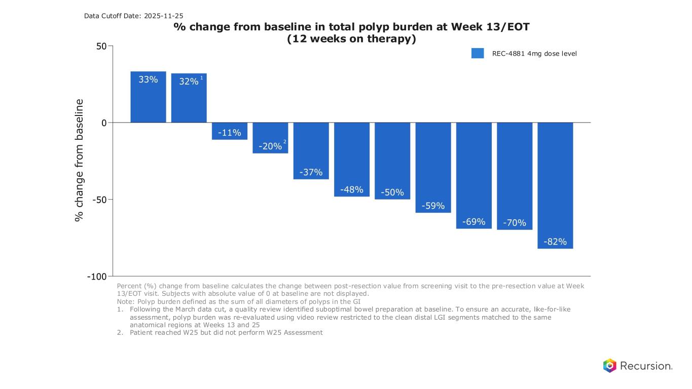 Percent (%) change from baseline calculates the change between post-resection value from screening visit to the pre-resection value at Week 13/EOT visit. Subjects with absolute value of 0 at baseline are not displayed. Note: Polyp burden defined as the sum of all diameters of polyps in the GI 1. Following the March data cut, a quality review identified suboptimal bowel preparation at baseline. To ensure an accurate, like-for-like assessment, polyp burden was re-evaluated using video review restricted to the clean distal LGI segments matched to the same anatomical regions at Weeks 13 and 25 2. Patient reached W25 but did not perform W25 Assessment REC-4881 4mg dose level % change from baseline in total polyp burden at Week 13/EOT (12 weeks on therapy) % c h a n g e f ro m b a s e li n e 1 2 Data Cutoff Date: 2025-11-25