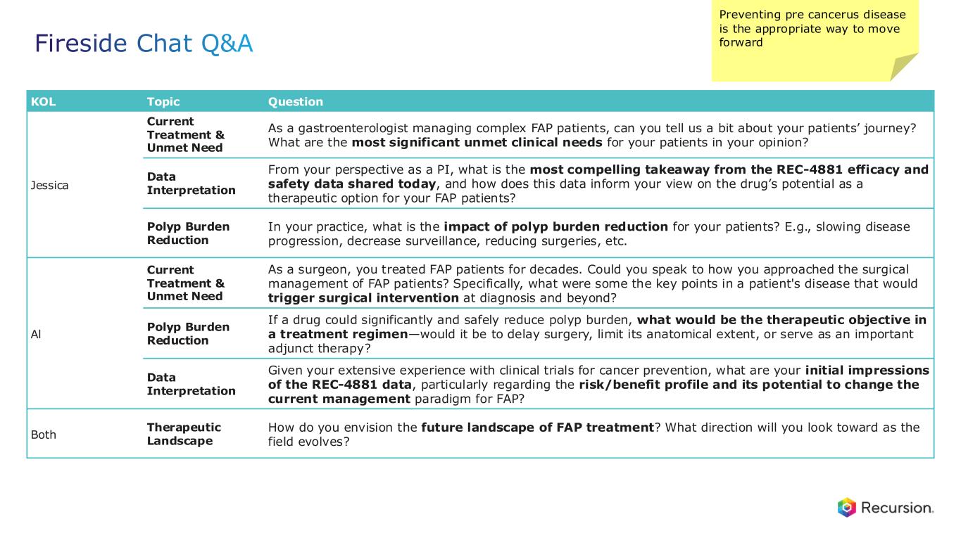 Fireside Chat Q&A KOL Topic Question Jessica Current Treatment & Unmet Need As a gastroenterologist managing complex FAP patients, can you tell us a bit about your patients’ journey? What are the most significant unmet clinical needs for your patients in your opinion? Data Interpretation From your perspective as a PI, what is the most compelling takeaway from the REC-4881 efficacy and safety data shared today, and how does this data inform your view on the drug’s potential as a therapeutic option for your FAP patients? Polyp Burden Reduction In your practice, what is the impact of polyp burden reduction for your patients? E.g., slowing disease progression, decrease surveillance, reducing surgeries, etc. Al Current Treatment & Unmet Need As a surgeon, you treated FAP patients for decades. Could you speak to how you approached the surgical management of FAP patients? Specifically, what were some the key points in a patient's disease that would trigger surgical intervention at diagnosis and beyond? Polyp Burden Reduction If a drug could significantly and safely reduce polyp burden, what would be the therapeutic objective in a treatment regimen—would it be to delay surgery, limit its anatomical extent, or serve as an important adjunct therapy? Data Interpretation Given your extensive experience with clinical trials for cancer prevention, what are your initial impressions of the REC-4881 data, particularly regarding the risk/benefit profile and its potential to change the current management paradigm for FAP? Both Therapeutic Landscape How do you envision the future landscape of FAP treatment? What direction will you look toward as the field evolves? NK 07-Dec-25: Surgical – major intervention (endoscopically and surgically) and don’t prophacalytically – patients with family history, surveillance Preventing pre cancerus disease is the appropriate way to move forward