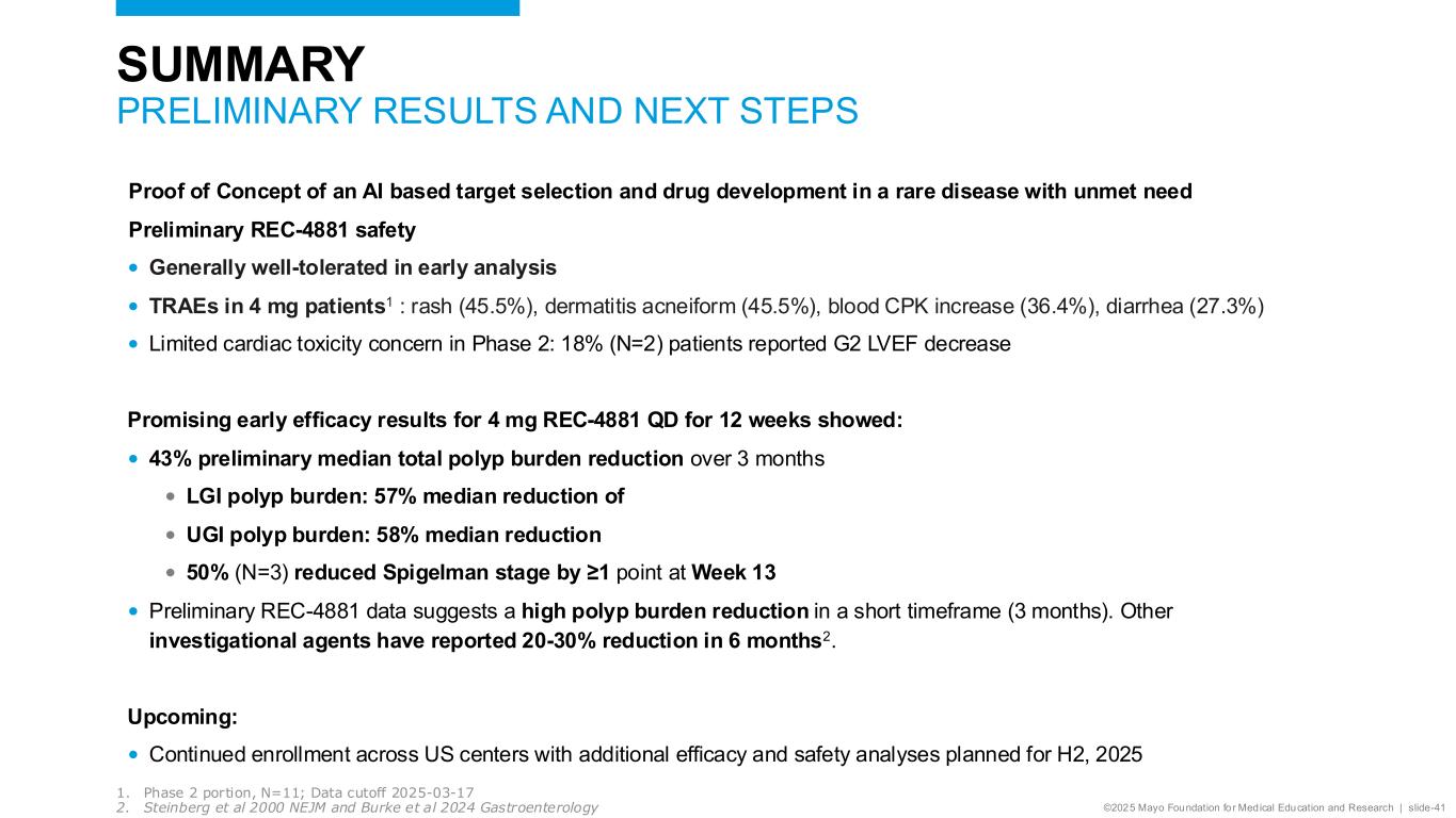 ©2025 Mayo Foundation for Medical Education and Research | slide-41 Proof of Concept of an AI based target selection and drug development in a rare disease with unmet need Preliminary REC-4881 safety • Generally well-tolerated in early analysis • TRAEs in 4 mg patients1 : rash (45.5%), dermatitis acneiform (45.5%), blood CPK increase (36.4%), diarrhea (27.3%) • Limited cardiac toxicity concern in Phase 2: 18% (N=2) patients reported G2 LVEF decrease Promising early efficacy results for 4 mg REC-4881 QD for 12 weeks showed: • 43% preliminary median total polyp burden reduction over 3 months • LGI polyp burden: 57% median reduction of • UGI polyp burden: 58% median reduction • 50% (N=3) reduced Spigelman stage by ≥1 point at Week 13 • Preliminary REC-4881 data suggests a high polyp burden reduction in a short timeframe (3 months). Other investigational agents have reported 20-30% reduction in 6 months2. Upcoming: • Continued enrollment across US centers with additional efficacy and safety analyses planned for H2, 2025 SUMMARY PRELIMINARY RESULTS AND NEXT STEPS 1. Phase 2 portion, N=11; Data cutoff 2025-03-17 2. Steinberg et al 2000 NEJM and Burke et al 2024 Gastroenterology