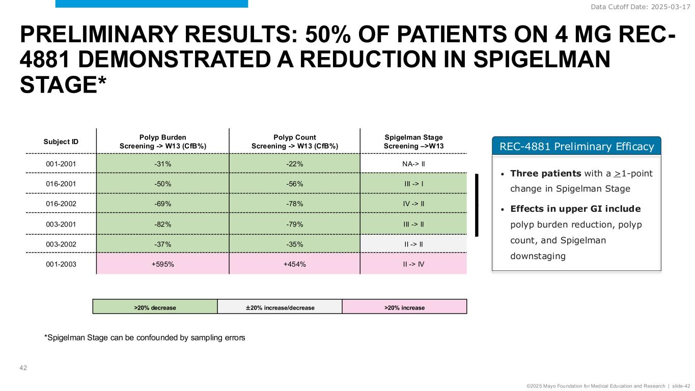 ©2025 Mayo Foundation for Medical Education and Research | slide-42 REC-4881 Preliminary Efficacy PRELIMINARY RESULTS: 50% OF PATIENTS ON 4 MG REC- 4881 DEMONSTRATED A REDUCTION IN SPIGELMAN STAGE* 42 Subject ID Polyp Burden Screening -> W13 (CfB%) Polyp Count Screening -> W13 (CfB%) Spigelman Stage Screening –>W13 001-2001 -31% -22% NA-> II 016-2001 -50% -56% III -> I 016-2002 -69% -78% IV -> II 003-2001 -82% -79% III -> II 003-2002 -37% -35% II -> II 001-2003 +595% +454% II -> IV >20% decrease ±20% increase/decrease >20% increase • Three patients with a >1-point change in Spigelman Stage • Effects in upper GI include polyp burden reduction, polyp count, and Spigelman downstaging Data Cutoff Date: 2025-03-17 *Spigelman Stage can be confounded by sampling errors